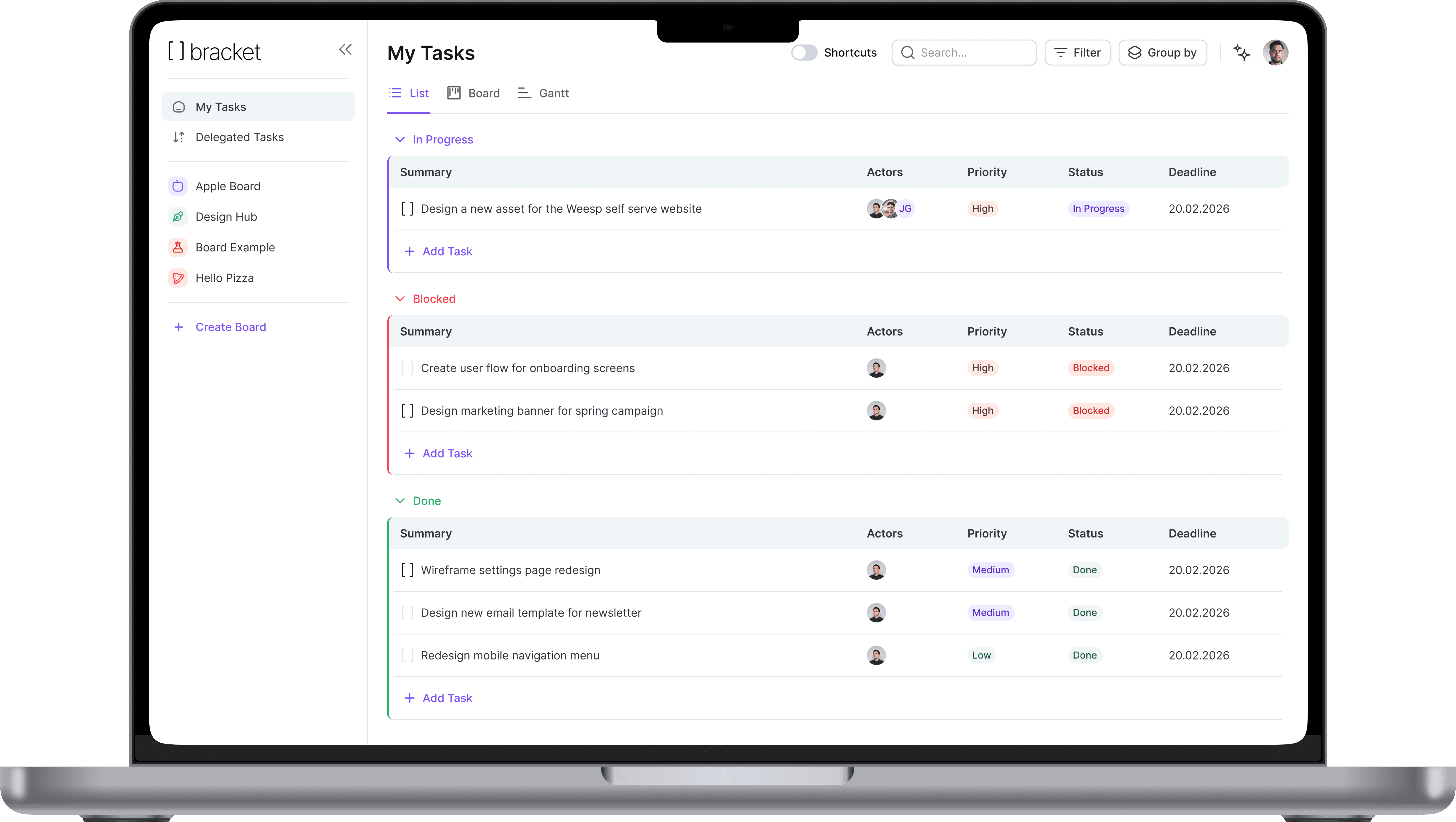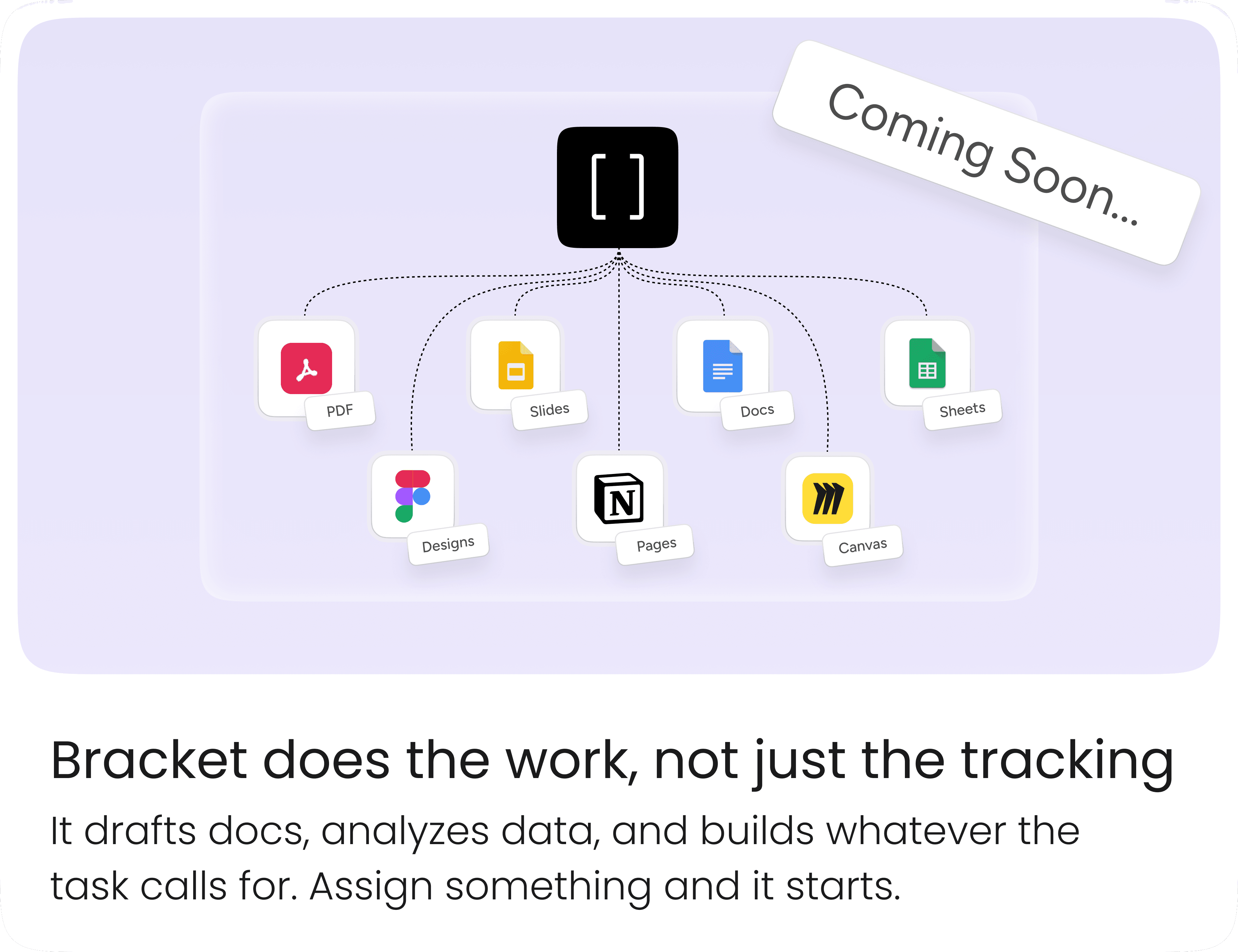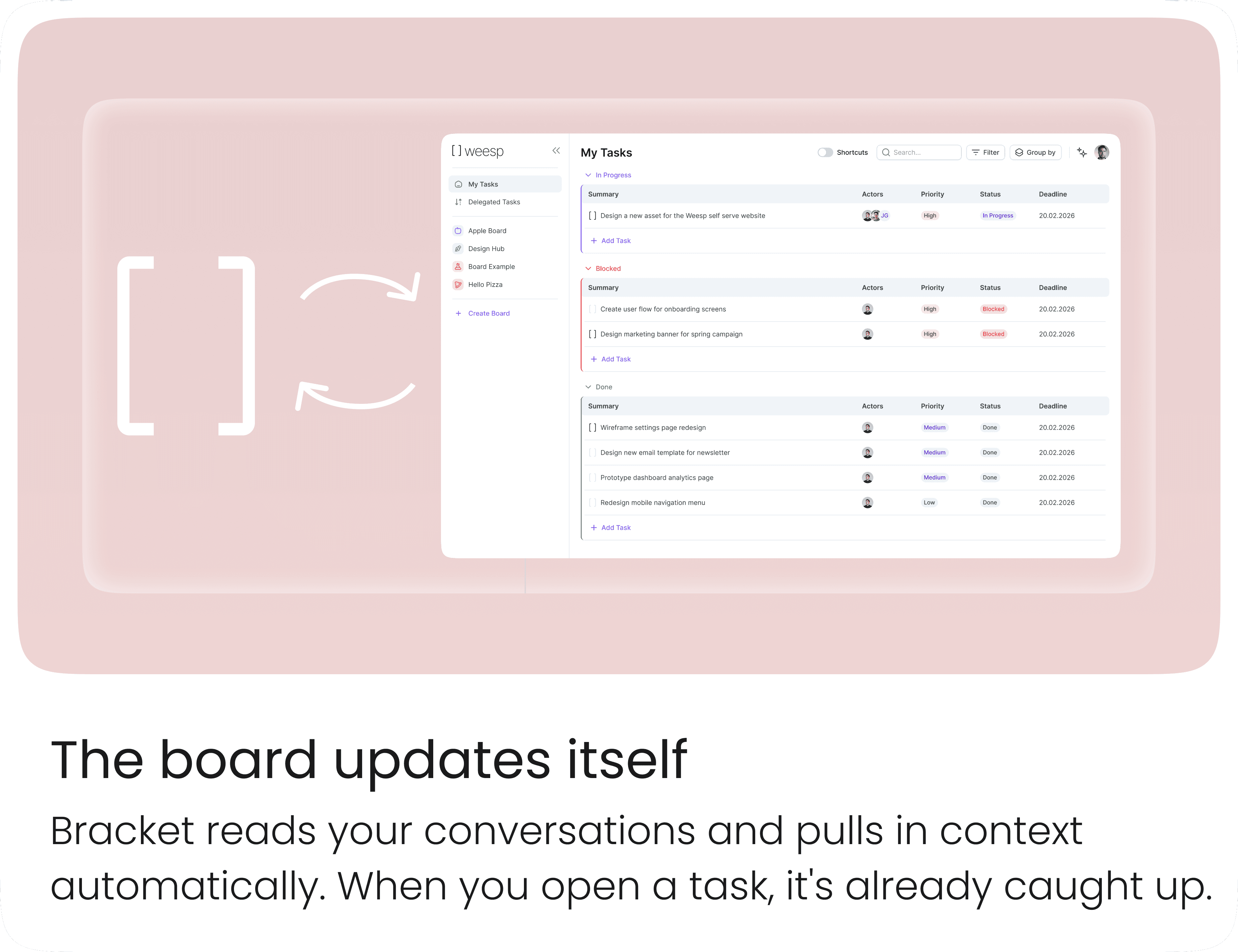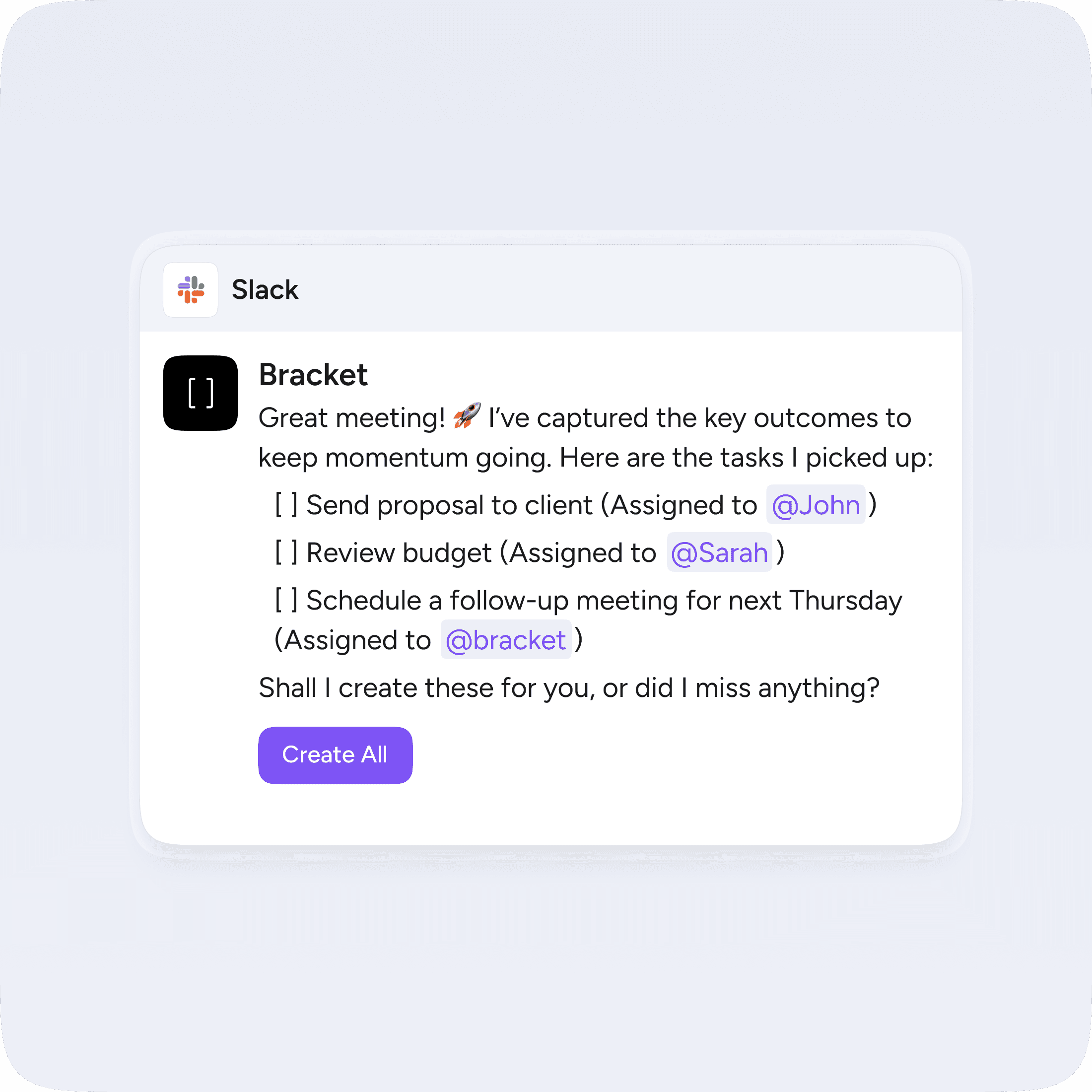 Connect Bracket to your note-taking app and it pulls out action items from each meeting, assigns them to whoever was on the hook, and drops them into your task board. You don't have to touch them.