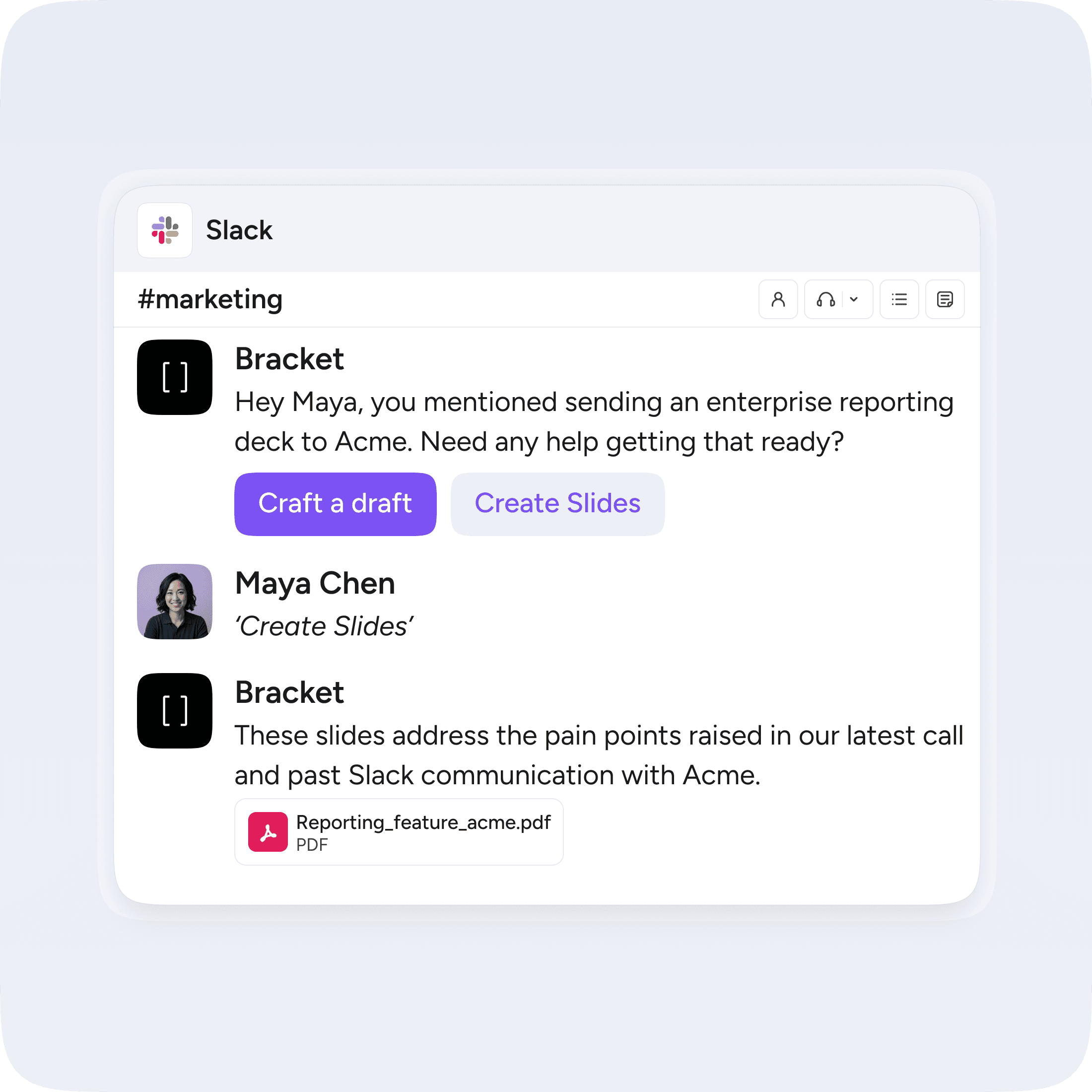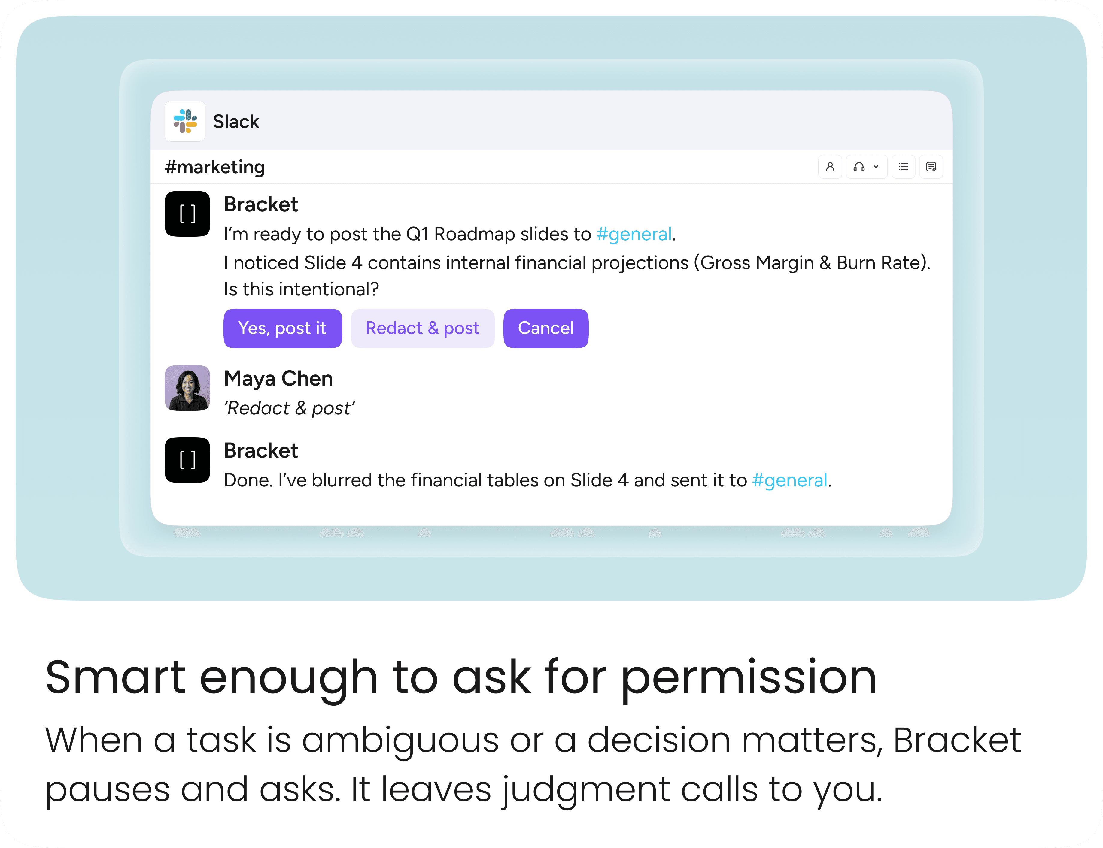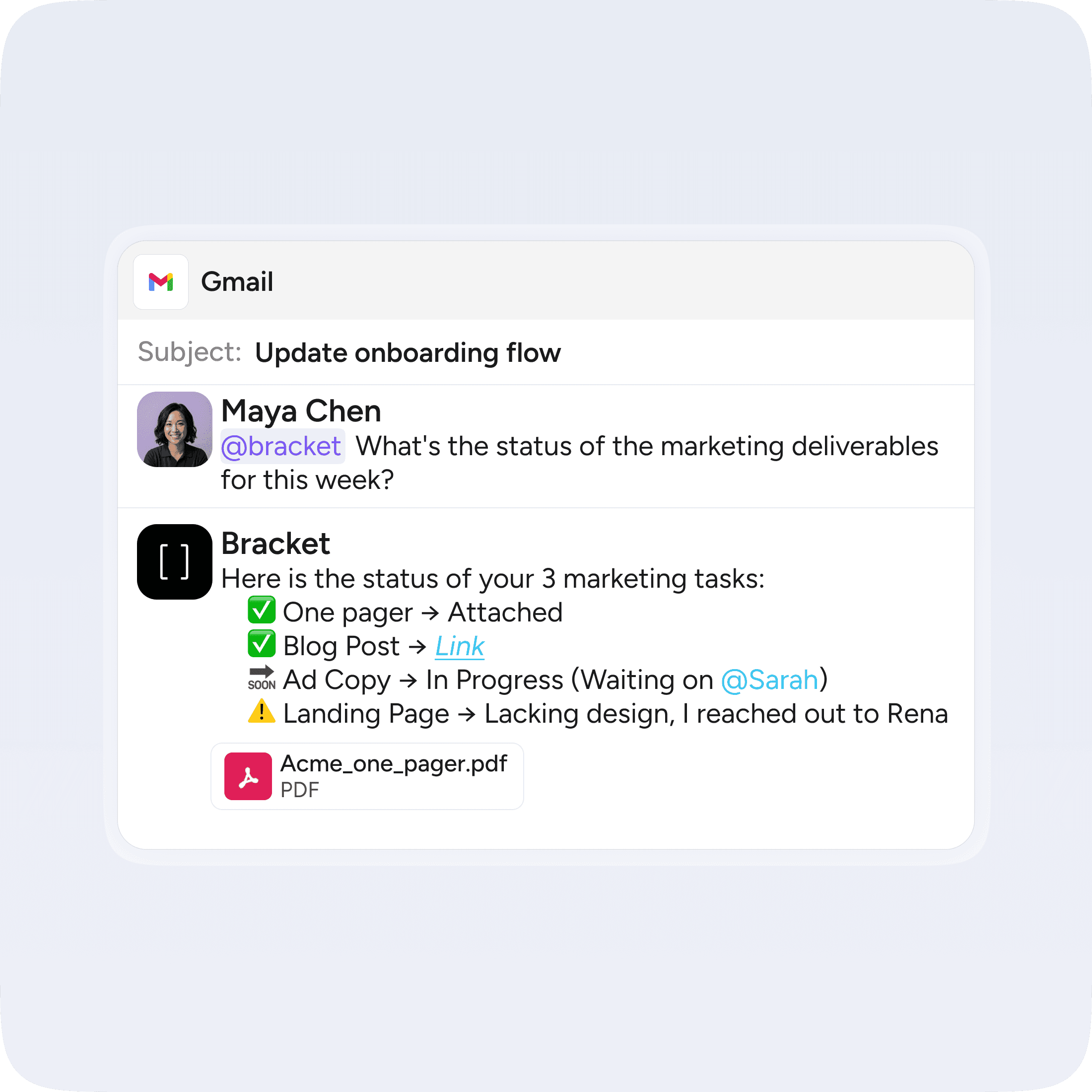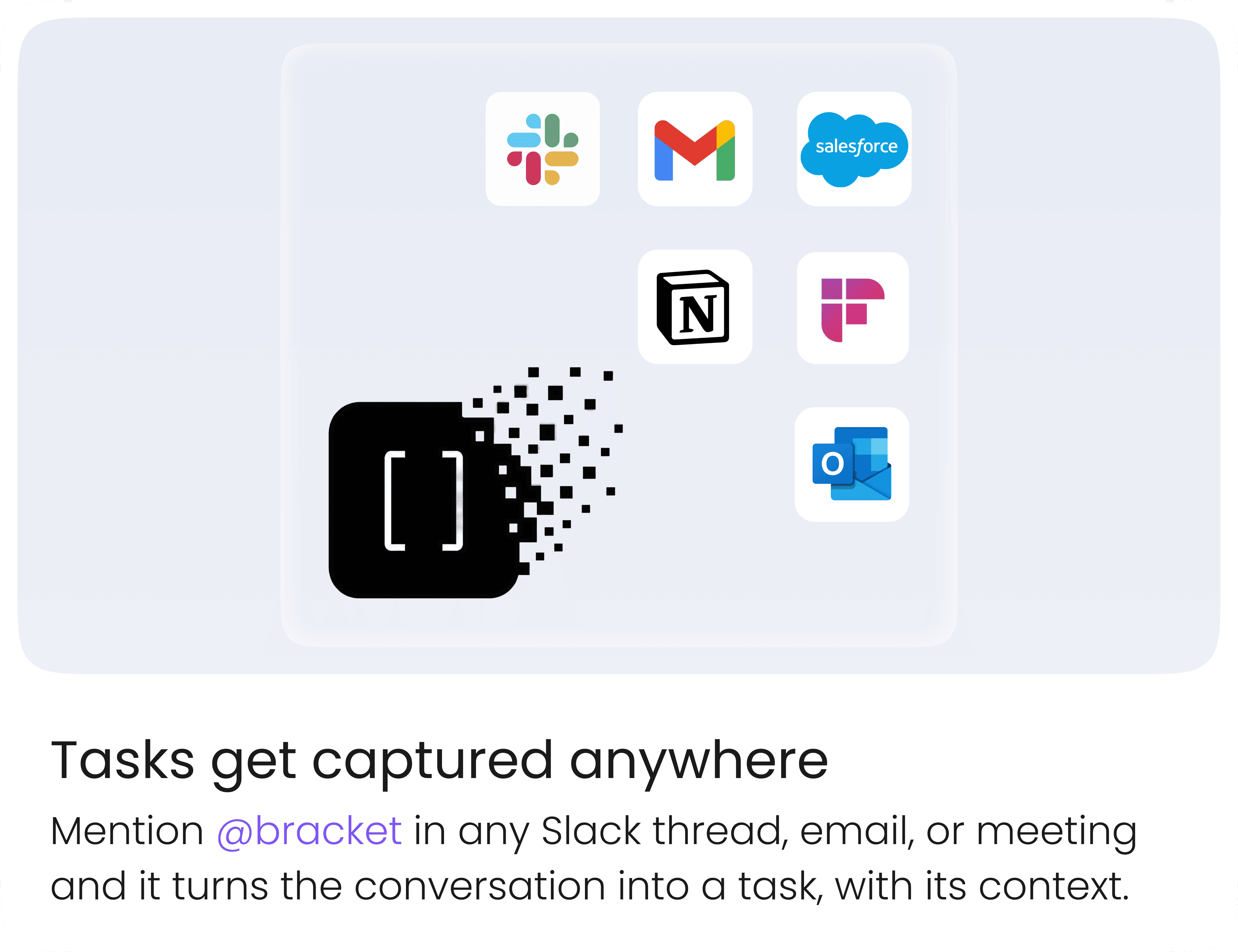 Type @bracket in any Slack DM, channel, or email thread. You can create a task, get context, check on someone else's progress, or update a deadline without opening another tab.